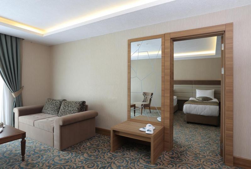 Junior Suit:Ara kapılı, 1 yatak odası + 1 oturma odası (çift kişilik açılır koltuk) ve 1 banyodan oluşur.