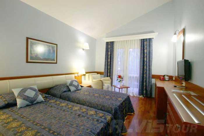 Otel muhteşem bahçeler içerisinde bulunan bir Akdeniz köyü havasında çok sayıda iki katlı ve geniş aralıklı olarak inşa edilmiş dairelerden oluşmakta. Misafirlere sunulan zengin imkanlar kolay ulaşabilmeleri için bir yürüyüş mesafesi kadar yakın onlara.