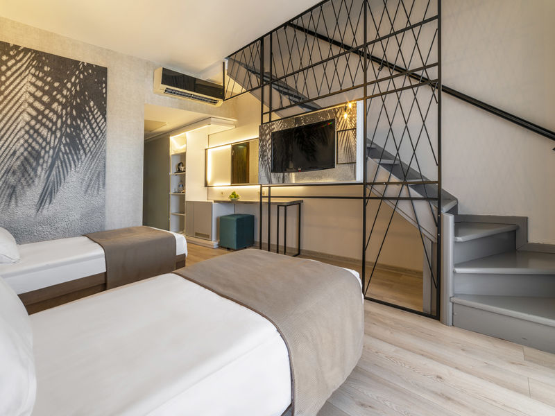 Hotel Dublex oda sayısı 44 adet olup 44 m2 olan odada alt katta iki tek kişilik yatak, üst katta çift kişilik yatak bulunmaktadır.Max. 4 yetişkin + 1 çocuk konaklama