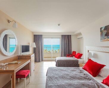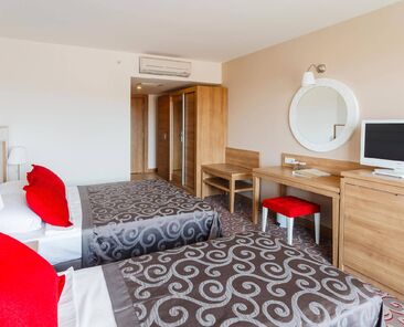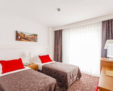 Standart Oda: 22 m² / Max. 3 Kişi / 1 yatak odası- İki kişilik ya da 2 adet tek kişilik yatak, split klima-mini bar,halı zemin, dijital kasa, 32” LCD / Satellite TV, Music Kanalı (TV ‘den yayın), telefone, 1 küvetli banyo, WC, saç kurutma makinesi, havlu terlik, kozmetik ayna, balkon.(3. kişi için tek kişilik ilave yatak.)