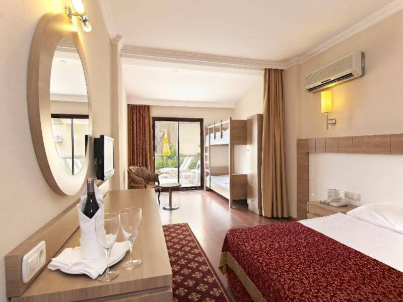 Ranzalı Aile Odası: 30 m² / Max. 3 Kişi / 1 yatak odası –1 adet iki kişilik yatak ve 1 adet Ranzalı yatak split klima-mini bar,halı zemin, dijital kasa, 32” LCD / Satellite TV, Music Kanalı (TV ‘den yayın), telefone, 1 küvetli banyo, WC, saç kurutma makinesi, havlu terlik, kozmetik ayna,Teras ‘da Şemsiye ve şezlong .