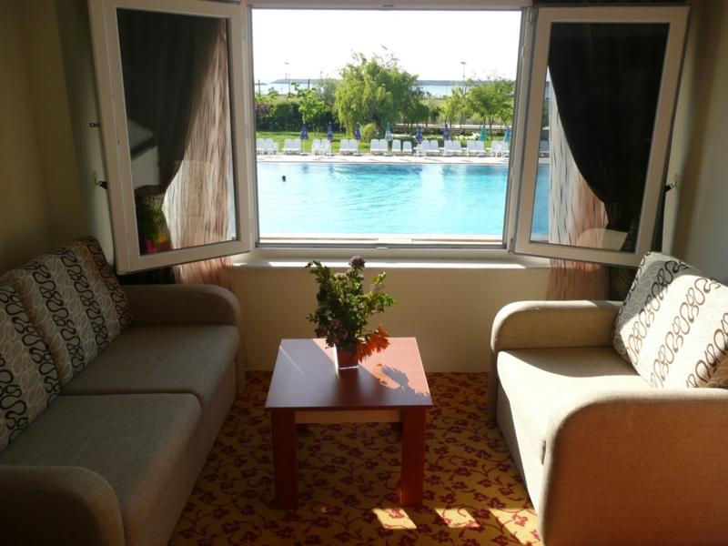Açık havuz çevresi 1100 m2 olup, şezlong ve şemsiyelerden yararlanarak huzur dolu bir rahatça güneşlenebilir ve bu eğlenceli ortamda denizi seyrederek hijyenik açık havuzumuzdan yararlanabilirsiniz. Havuz Barda istediğiniz içkiyi yudumlarken aşçıbaşımızın çeşitli mönülerinden tadabilirsiniz.