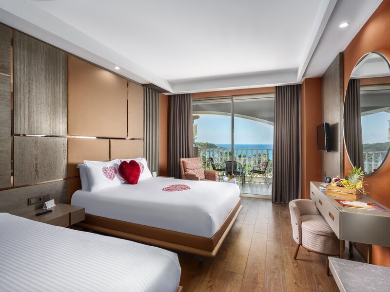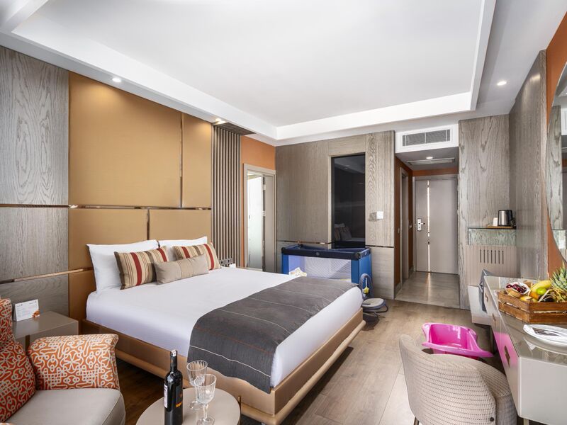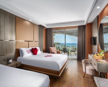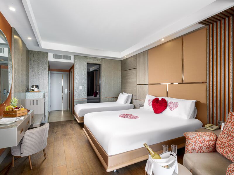 Aile Odaları: 40 adettir. 39 m² genişliğindedir. Max. 4+1 kişilik konaklamaya uygundur. Bir çift ve üç tek kişilik yatak, ara kapılı ve iki odadan oluşmaktadır.