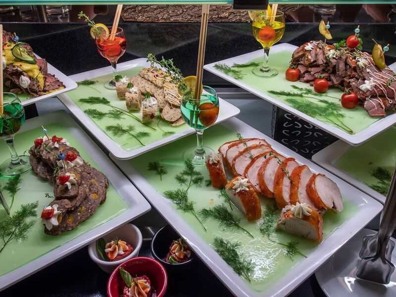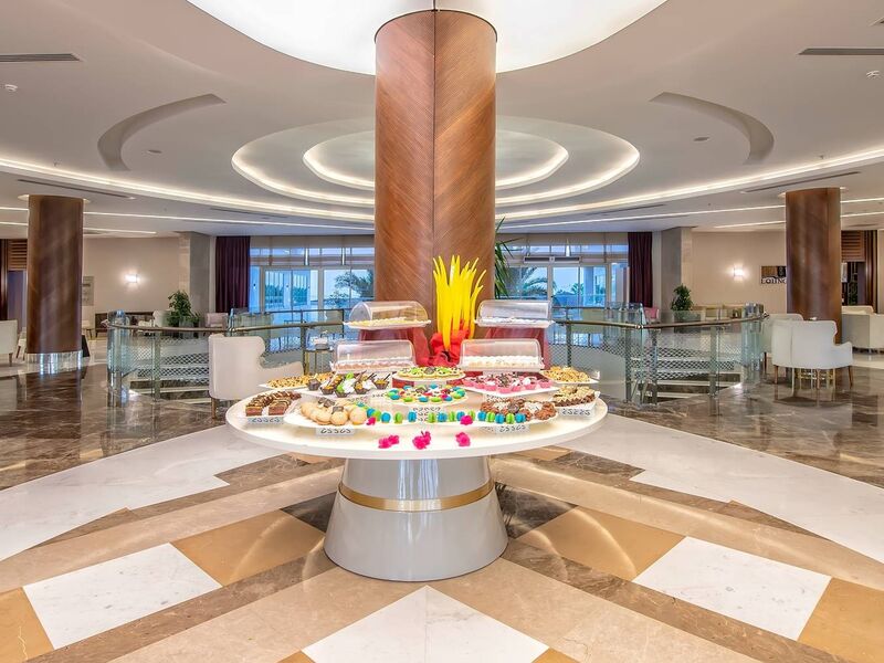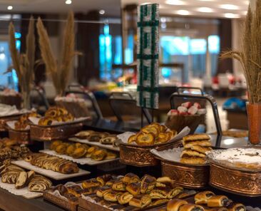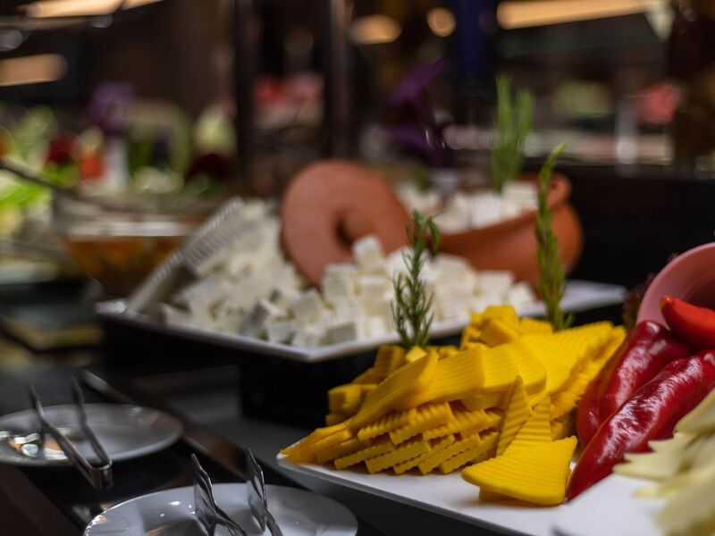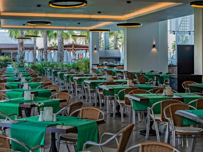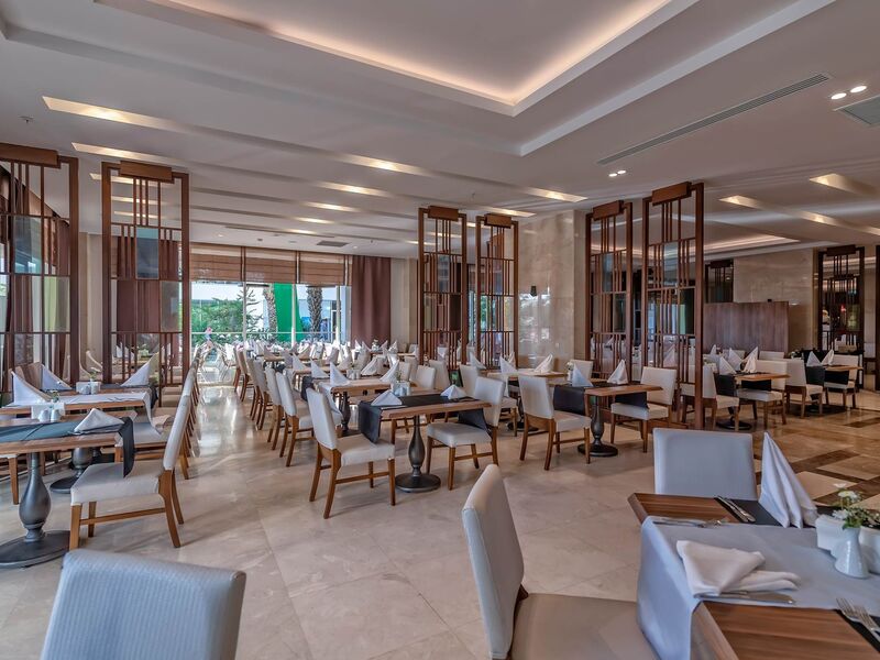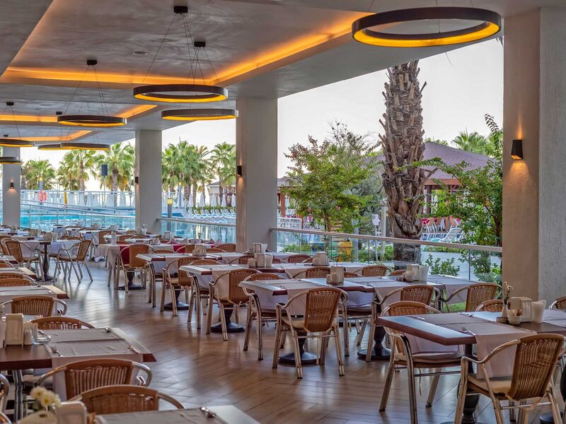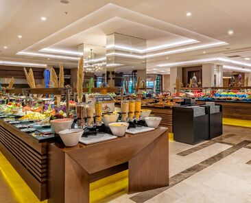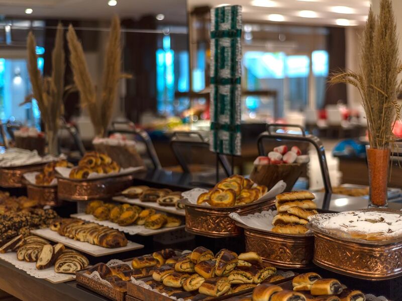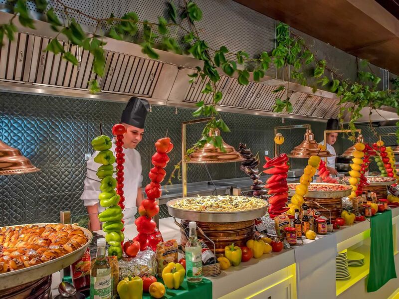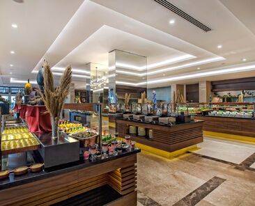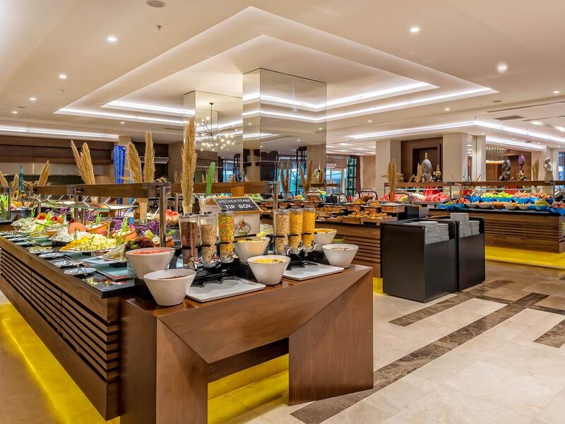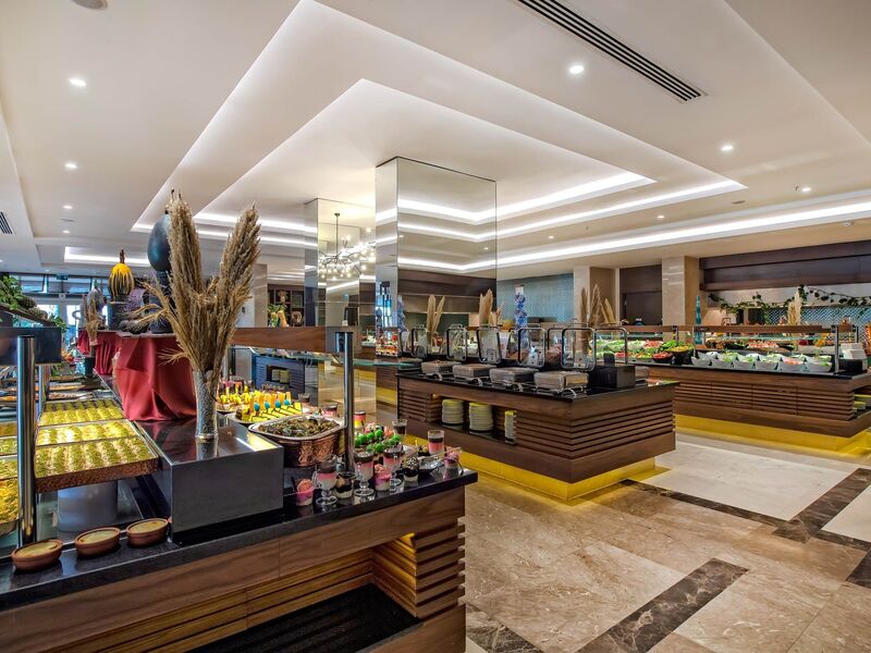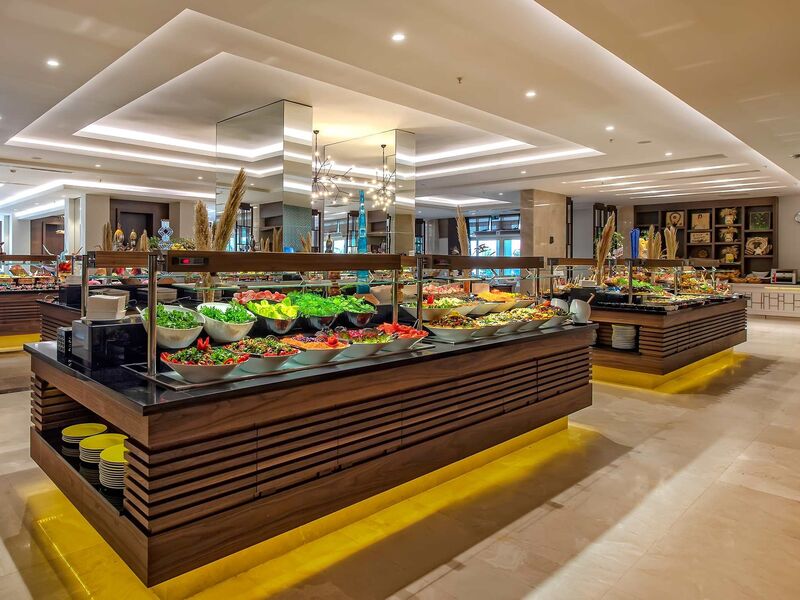 Sabah kahvaltısı, öğle ve akşam yemekleri açık büfe olup tesisin belirlediği markalar dahilinde alkollü-alkolsüz yerli ve bazı yabancı içecekler 24 saat ücretsiz sunulmaktadır.