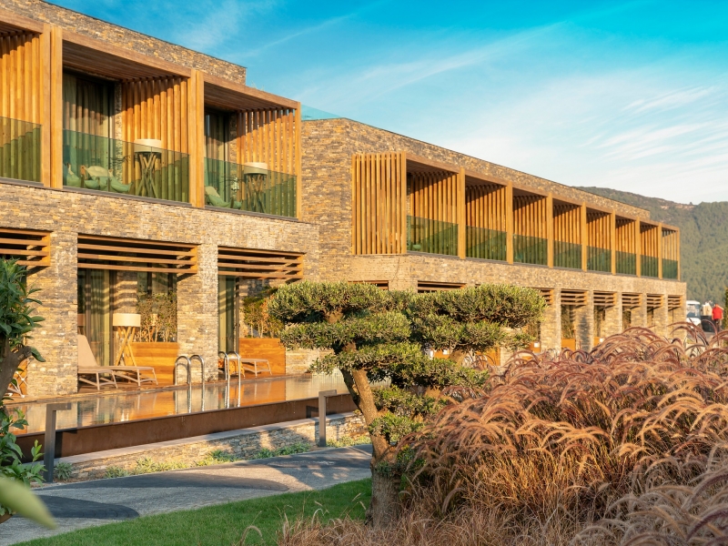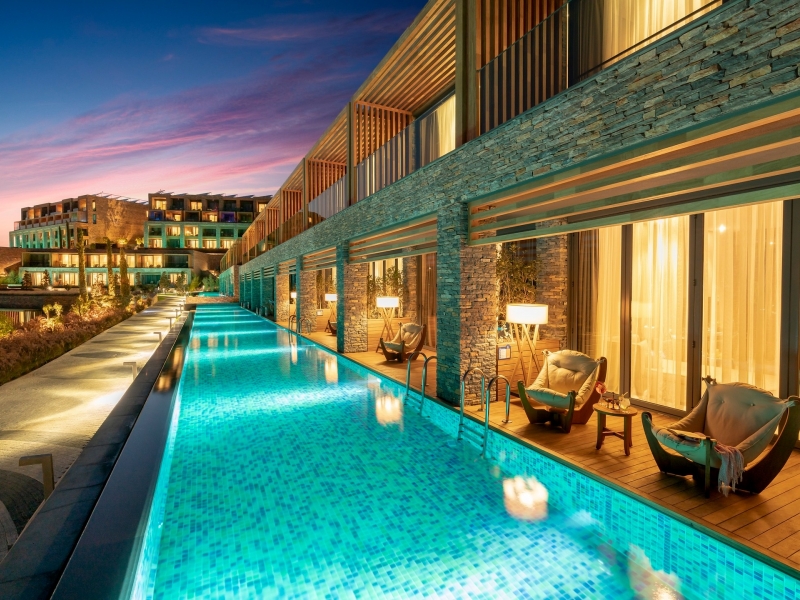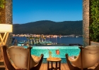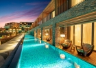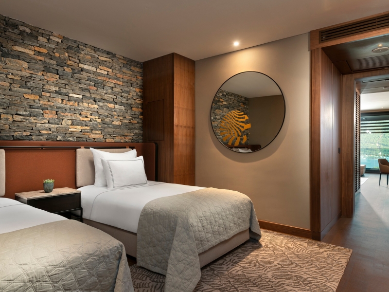 Lujo 2 Bedroom Villa (+ 1 butler bedroom): 250 m2, tam deniz manzaralı, 1 çift kişilik geniş yatak (2m*2m) ve 2 adet 2 tek kişilik (1.20m*2m) yataktan oluşan 3 yatak odası, tüm odalar banyolu ve giyinme bölümlü, teras, ısıtmalı özel havuz ve özel güneşlenme alanı