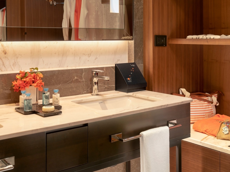 Superior Room Partly Sea View: 45 m2, kısmi deniz manzaralı, 2 tek kişilik yatak (1.20m*2m) ya da 1 çift kişilik geniş yatak (2m*2m), sofa, banyoda duş, tuvalet, çift lavabo, giyinme bölümü, balkon ve balkonda koltuk