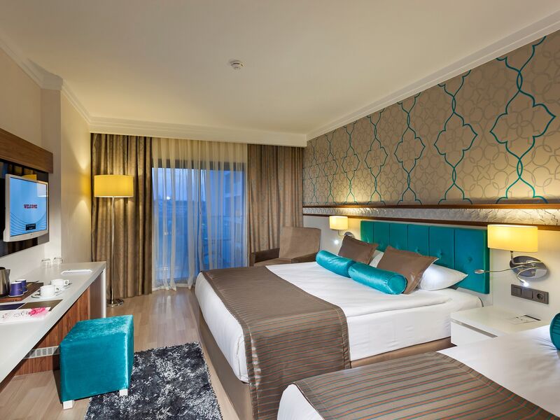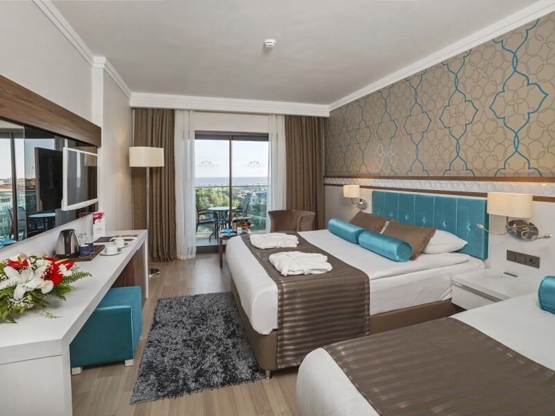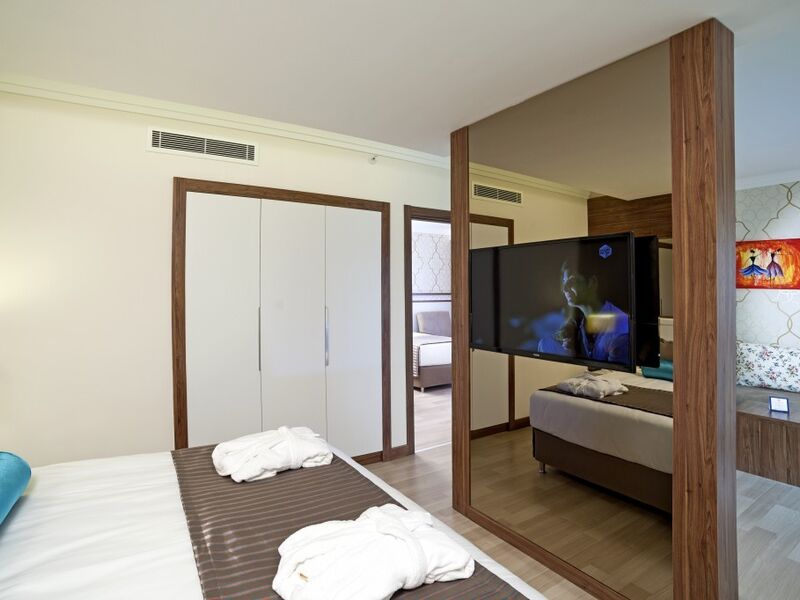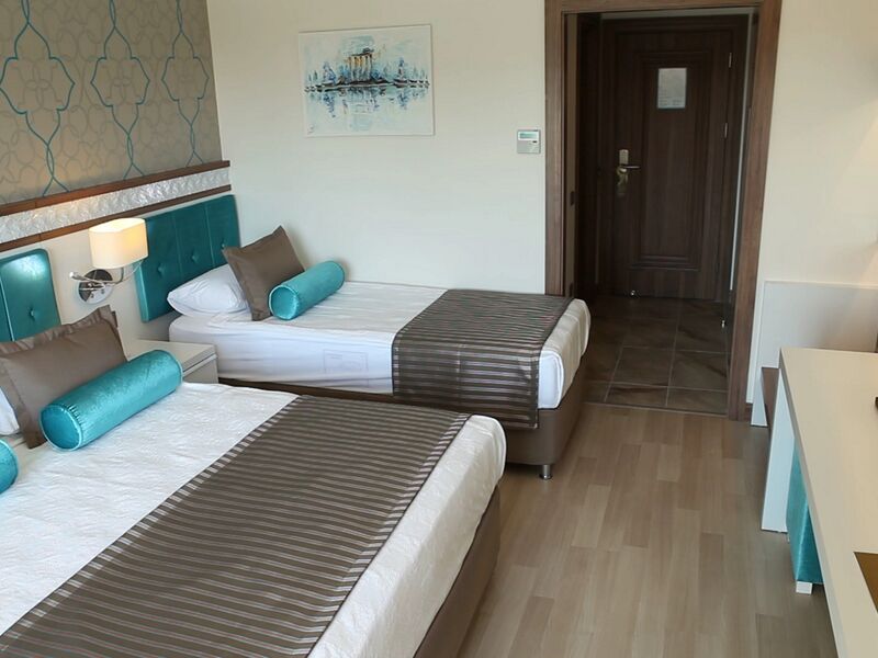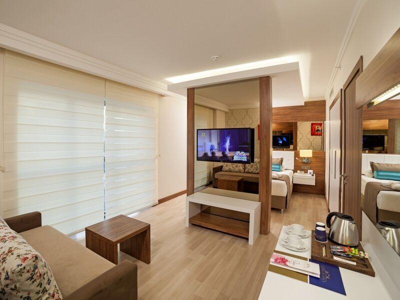 AİLE ODASI ( Maksimum Kapasite 4 Kişi )Sadece kara tarafında olmak üzere toplam 55 oda bulunmaktadır. Balkon hariç 35 m2 olup, 2 yatak odası ara kapılı ve tek banyoludur.