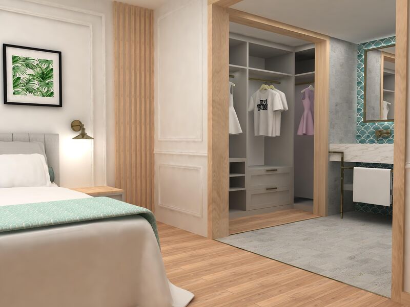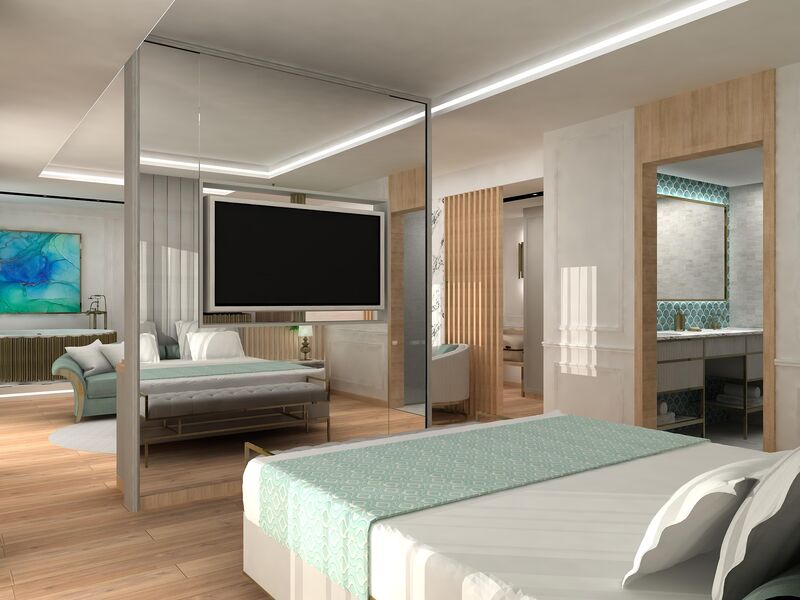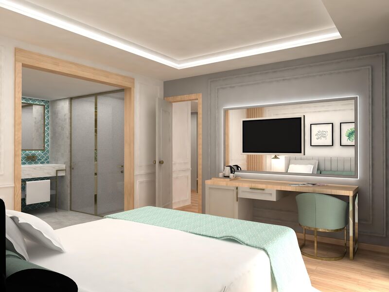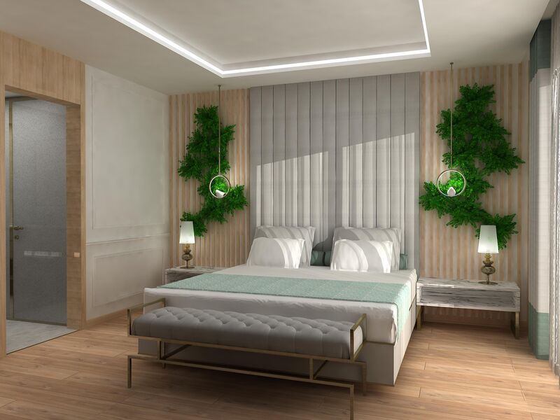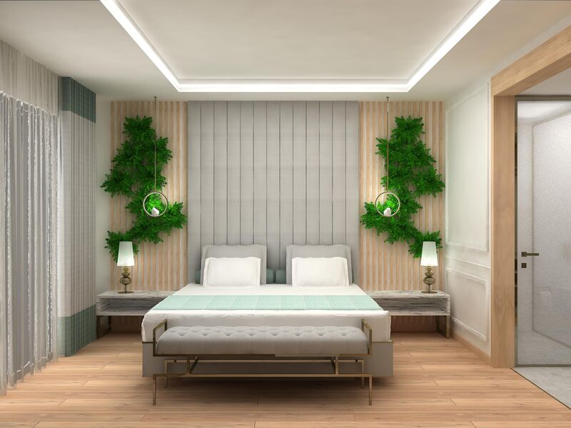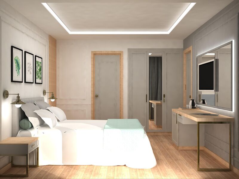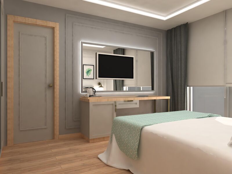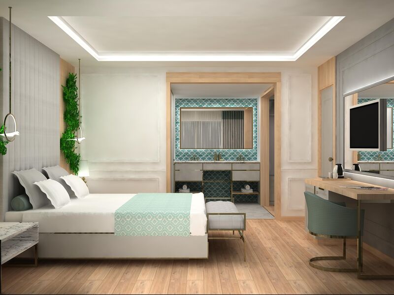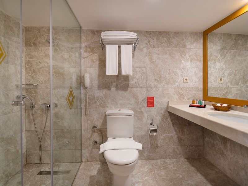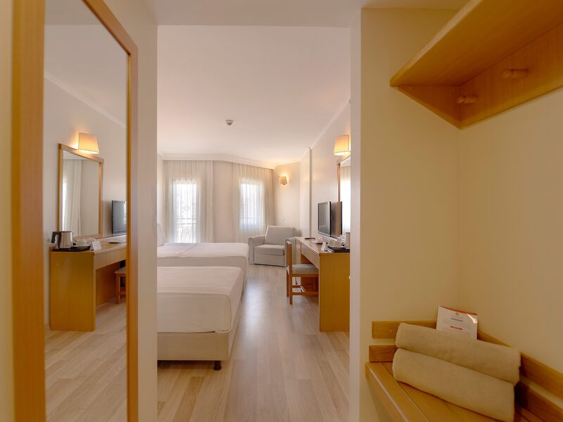 Anabina odaları duş, yanbina kuvet /WC, para kasası, TV, direk telefon, Fön, laminat zemin,merkezi klima(belirli saatlerde), balkon, isteğe göre deniz-havuz veya kara manzaralı, küçük buz dolabı mevcuttur.
