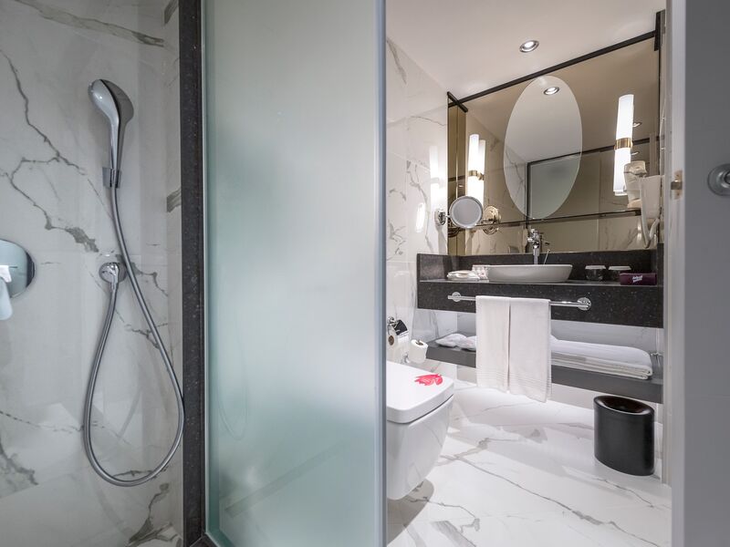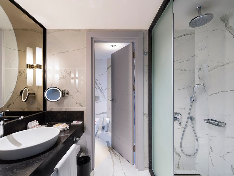 soyunma köşesi, Duş / WC ayrı, iki Lavabo, Merkezi Klima, Telefon, LCD TV, Uydu Yayını, Kablosuz İnternet, Fön, Bornoz & Terlik, Makyaj Aynası, Mini Bar, Kasa, Su Isıtıcısı ve Çay Kahve seti, Nespresso Kahve Makinesi,Geniş Balkon. Lüks oda