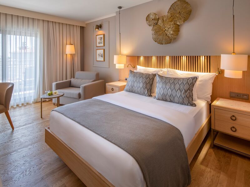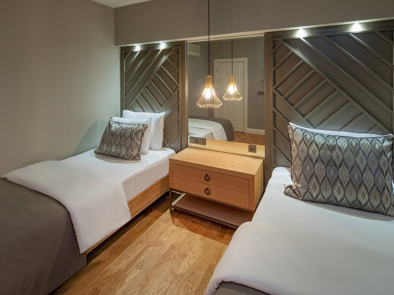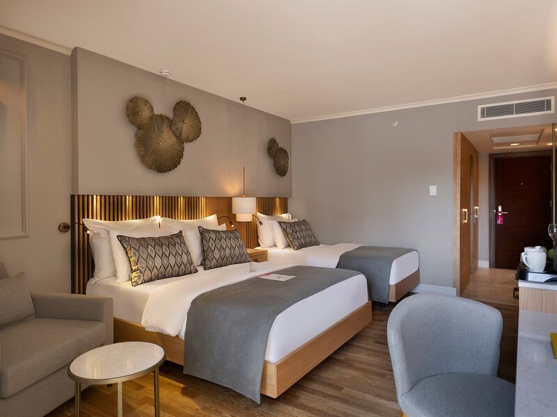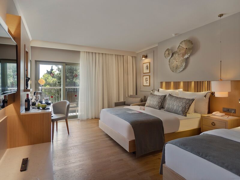 Deluxe Bahçe Manzaralı Oda 58 34 İki adet tek kişilik yatak ve bir adet (açıldığında çift kişilik yatak olabilen) kanepe bulunmaktadır. Balkon, duş kabini, WC, klima, direkt telefon, radyo, LCD-TV, Dijital uydu yayını, fön, mini bar,emanet kasası, su ısıtıcı, çay ve kahve, Kablosuz internet , bornoz ve terlik bulunmaktadır. Zemin laminant parke kaplamadır. Max. 2+2 veya 3 kişi