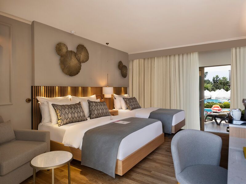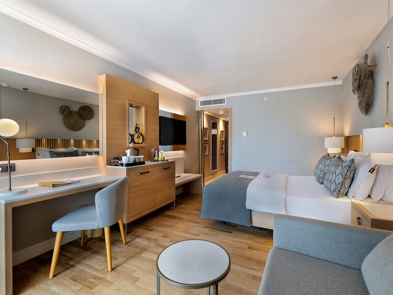 Deluxe Swim Up Oda 22 34 İki adet tek kişilik yatak ve bir adet (açıldığında çift kişilik yatak olabilen) kanepe veya bir adet çift kişilik yatak ve bir adet tek kişilik yatak bulunmaktadır. Oda terasından havuza girme imkanı mevcuttur. Teras, duş kabini, WC, klima, direkt telefon, radyo,LCD-TV, Dijital uydu yayını, fön, mini bar, emanet kasası, su ısıtıcı, çay ve kahve, Kablosuz internet ,bornoz ve terlik