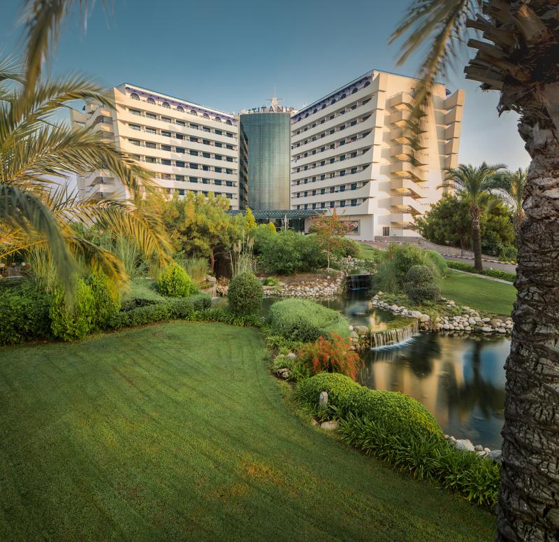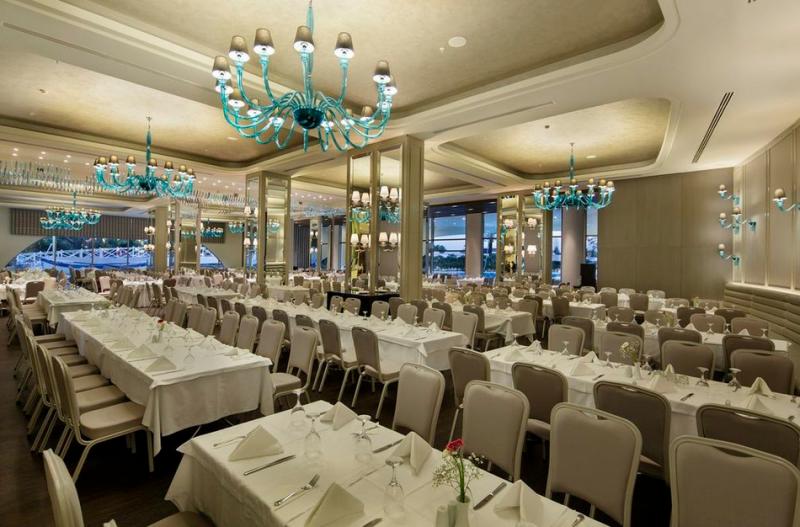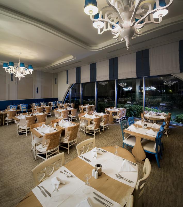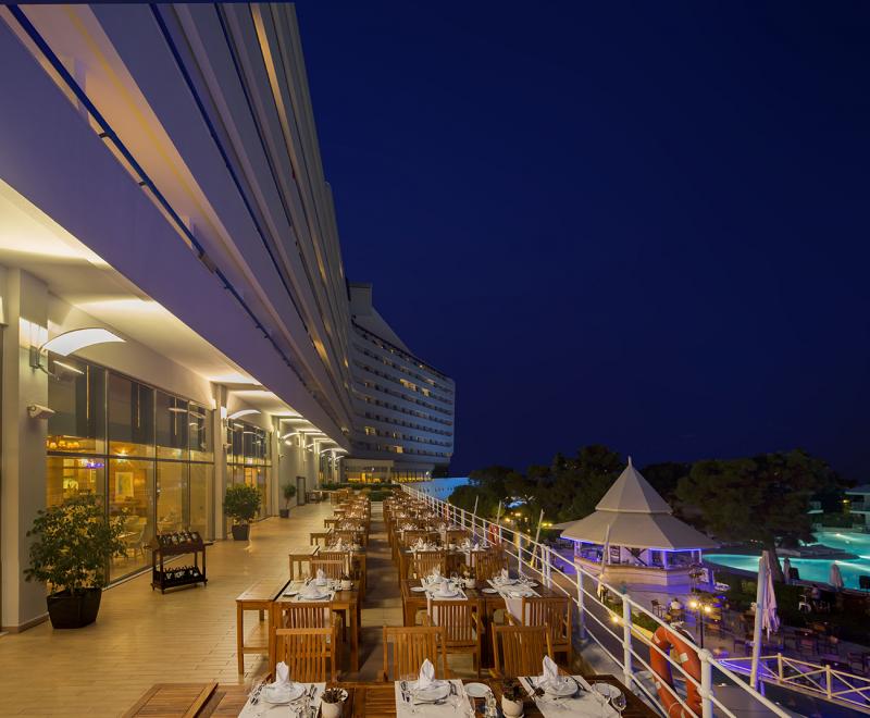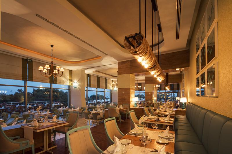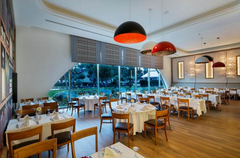 Otelin ziyaretçileri ana restoran Parkfora Restaurant, Hasır a’la carte Restaurant, Sapore a’la carte Restaurant (İtalyan Mutfağı), Çapari a’la carte Restaurant (Deniz Ürünleri), Stella Snack Restaurant, İskenderchi (Döner Restaurant), Pizzeria (Pizza Restaurant), Otağ Çadırı (Hamur işleri) ve Gece Snack Restaurant'tan faydalanabilirler.